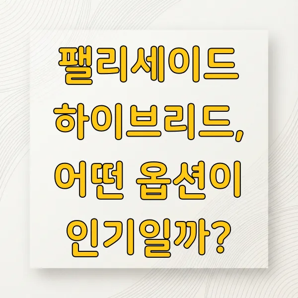 트림 선택만큼이나 고민스러운 것이 바로 옵션 선택입니다. 팰리세이드 하이브리드 구매자들 사이에서 특히 인기가 많은 옵션들을 몇 가지 살펴보겠습니다.